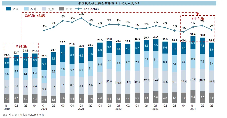 我们类似地选取4家国内顶级药企的销售额作为对照,可以发现这几家中国药企在前几年的业绩增长都显著慢于MNC、年化增速在5%多;2024年以来基本也没太大起色,不过三季度同比增速也归零了,需要看四季度是不是也要出现大幅滑坡,如果大概率不至于像MNC那样大幅回撤,那可能确实出现了内外资在中国市场份额换手的情况。此外,还有个细节观察,外企中国区的季节性波动更加明显,每年四季度都有比本土企业更大的“坑”。