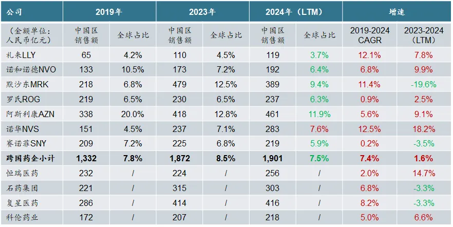 然而,很明显从2024年下半年开始,各类有关集采和谈判的负面情绪在进一步积累,从企业端特别是外企传来了诸多压力陡增的信号,因而有必要从客观数据出发来验证主观感受。整体而言确实不容乐观,有多家MNC在中国区的业绩从2024年下半年开始失速,在维持多年基本平稳之后(除疫情波动外),突然出现销售额同比大幅下滑以及占全球比重大幅下降的情况。虽然每家公司的剧情各有不同,但整体发生这么大幅度的波动,似乎确实提示了某些趋势性的变化。