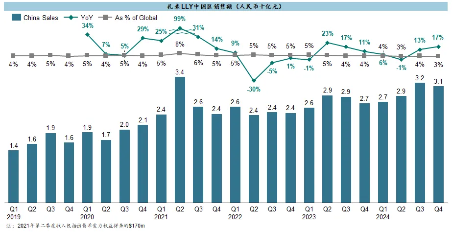 对于宇宙第一大药企礼来而言,中国区的存在感实在弱到了可有可无的地步,近年来更是逐渐下滑到只占全球销售额3%的水平、位居所有MNC中最低,这里面还有相当一部分是由信迪利单抗贡献。在Tirzepatide国内获批上市后,同比增速迅速起飞,但明显在全球布局中仍是极弱势环节,因而全球占比还在下降。