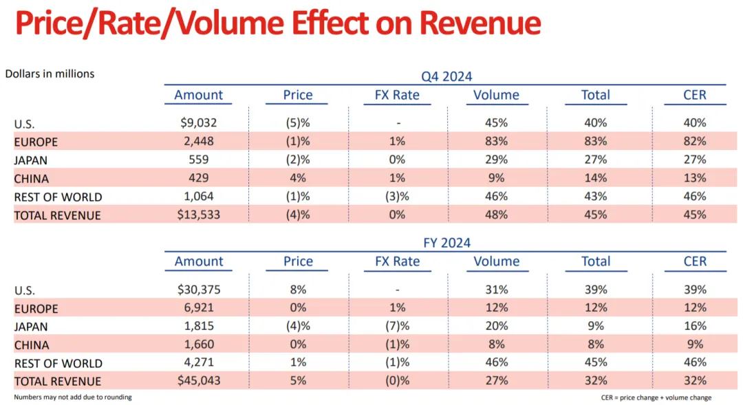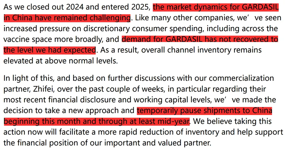 不止如此,在2024年8月,公司官宣暂停在中国供应其两款流感疫苗(而且还不像默沙东那样给了个恢复供应的预期时间),直接导致进入四季度后销售额同比大跌,让中国区业绩雪上加霜。