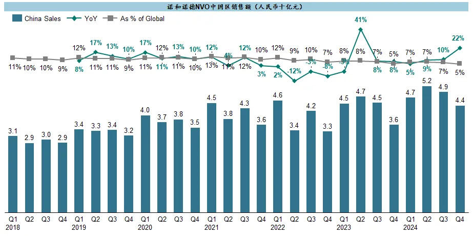 诺和诺德凭借一款Semaglutide在全球气吞万里如虎,在中国区却逊色很多,甚至近两年同比增速都很少超过10%,于是中国区的占比也一路从最高13%滑坡到了5%。