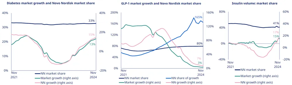 事实上,GLP-1对中国T2D市场的增量贡献并不算明显(这里面可能有大量off-label使用的统计难题),事实上到了2024年基本上增速已经滑落到10%以下(参见【药海听涛】远在天边还是近在眼前:GLP-1的天花板之谜);反倒是胰岛素业务,经历2022年集采冲击后,慢慢从深坑里爬出来,重新回到15%左右增速。