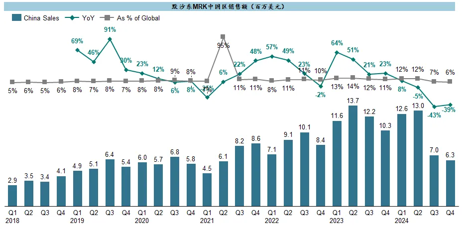 默沙东在中国的成长可谓成也萧何败也萧何,原本依靠K药+HPV疫苗的双轮驱动,一举成为中国区业绩成长最快的MNC之一,2018-2023年翻了三倍有余,占全球销售额比例也从5%提升到10%以上,仅次于阿斯利康;然而2024年中HPV突然爆雷,销售额绝对值直接一夜回到解放前,且能否回来都在未定之期了。