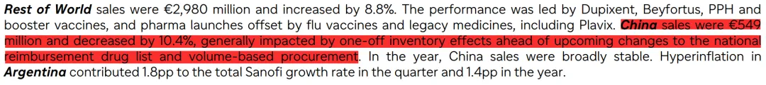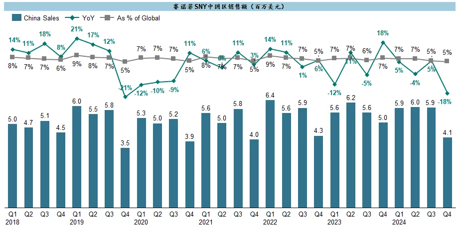 赛诺菲虽然手握Dupi这种超重磅品种在全球市场大杀四方,奈何自免在中国市场体量绝对值终究有限,且公司其他产品又持续拉胯,等于把这种仰Dupi之鼻息的问题更加放大,多年以来中国区业绩已经没什么实质增长,占全球比重也就只能停留在5%左右的边缘水平。
