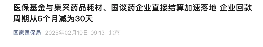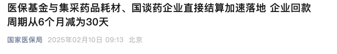 2月10日,国家医保局发布《医保基金与集采药品耗材、国谈药企业直接结算加速落地 企业回款周期从6个月减为30天》。