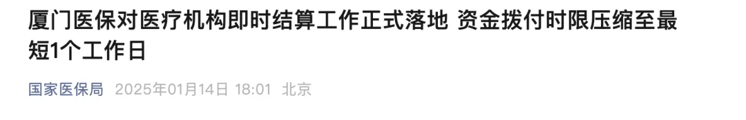 厦门医保即时结算采用“日报、日审、日拨”的形式,将基金拨付时限由过去的30个工作日压缩至最短1个工作日。