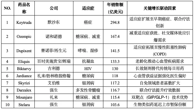其中以Keytruda、Ozempic和Dupixent组成的“超级三巨头”表现尤为抢眼,三款明星产品以42%的占比(约604亿美元)强势主导市场,头部效应进一步加剧。