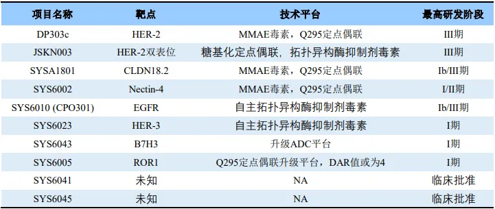 JSKN003目前正在进行两项III期临床,其也是全球首个启动III期临床的双抗ADC药物。2023年率先启动了治疗HER2低表达的、一线或二线治疗失败的复发或转移性乳腺癌III期临床,2025年2月刚刚启动对比恩美曲妥珠单抗(T-DM1)治疗HER2阳性晚期乳腺癌的III期临床研究,未来值得期待。再次回到石药集团的自主研发管线,成功开发了DP303c后,基于Q295的定点偶联技术平台,石药集团继续开发了CLDN18.2 ADC药物SYSA1801和Nectin-4 ADC药物SYS6002,并且两者都实现了海外授权。