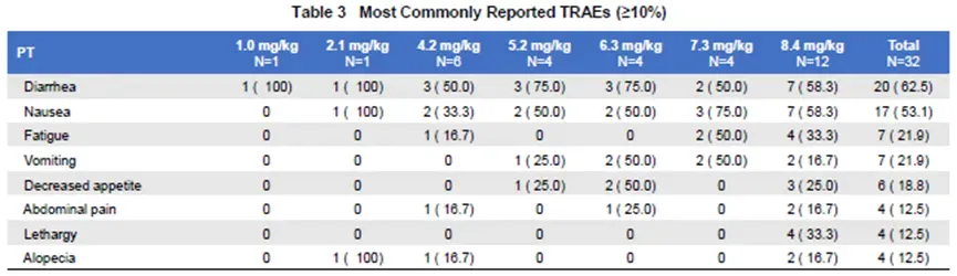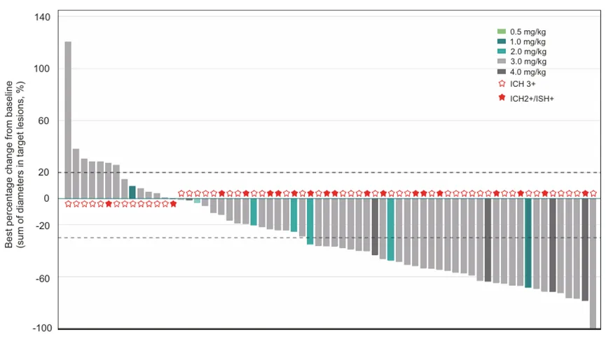 在HER2阳性患者中,15例乳腺癌患者的ORR为73.3%,5例胃癌患者的ORR为80%;在HER2低表达患者中,9例乳腺癌患者的ORR为33.3%,5例胃癌患者的ORR为20%。中位治疗时间为19.2周(约4.5个月),3级TRAEs发生率仅为19.6%(9/46 pts),无3级以上TRAEs。3例(6.5%)患者发生治疗相关严重不良事件(SAEs),1例为3级恶心,2例为2级间质性肺炎,未发生剂量限制性毒性(DLT)事件,无TRAE导致终止治疗。JSKN003中国I期临床结果