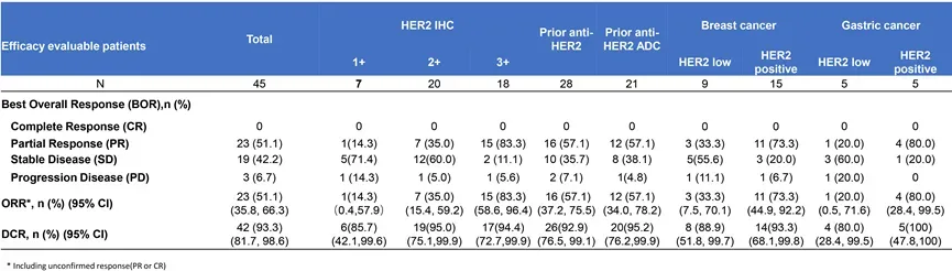 2024年ASCO期间公布中国I期临床数据显示,45例患者可进行总体有效性分析,ORR为51.1%(23/45),DCR为93.3%。IHC 1+、2+和3+患者的ORR分别为14.3%(1/7)、35.0%(7/20)和83.3%(15/20),最高剂量爬升至8.4 mg/kg。其中,既往接受过抗HER2治疗的患者ORR达到了57.1%(16/28),21例既往接受过抗HER2 ADC治疗的患者ORR达到了57.1%(12/21)。