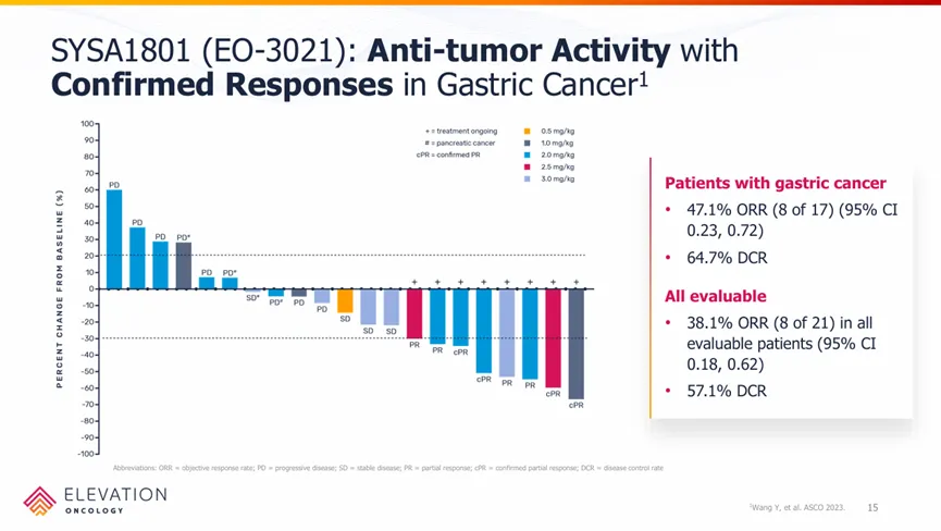 2023年ASCO期间,EO-3021/SYSA1801公布了其在中国进行的I期临床数据,17例可评估的胃癌患者中,客观响应率达到47.1%,疾病控制率达到64.7%。