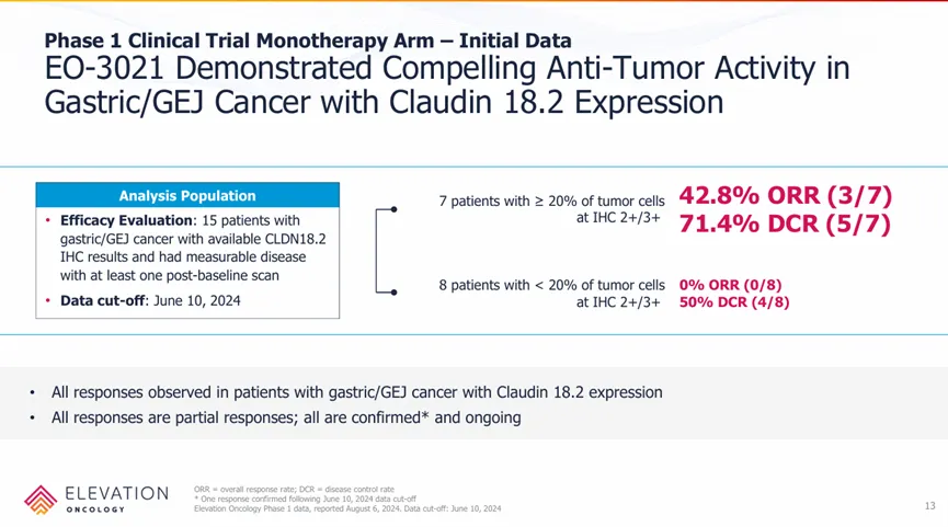 来到美国临床,Elevation Oncology对EO-3021/SYSA1801的临床设计更为激进,起始剂量从0.5mg/kg提升到1mg/kg,同时对入组患者的CLDN18.2表达量不做要求,而此前中国患者的CLDN18.2表达量严格控制在>1%。就是这一激进设计几乎让Elevation Oncology陷入绝境,2024年8月6日,Elevation oncology公布EO-3021在美国开展I期临床结果,15位可评估患者中的响应率仅为20%,还包括一例未确认PR,远低于此前中国I期临床的47%响应率,基于此消息Elevation oncology股价暴跌63%。但将美国临床中的CLDN18.2表达量>20%的七位患者进行分层分析,其响应率和疾病控制率分别为42.8%和71.4%,和此前中国临床的数据基本一致,仍然还有机会,>20%也和其它几款CLDN18.2 ADC入组的表达量要求类似。