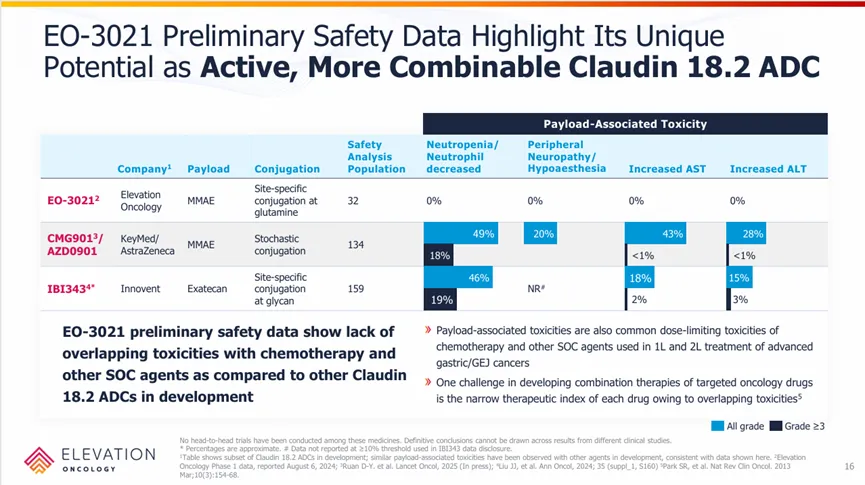 同时在安全性方面,和其它CLDN18.2 ADC比较,EO-3021/SYSA1801也显示出更低的毒素相关毒性,进一步凸显其结构差异化设计的优势。