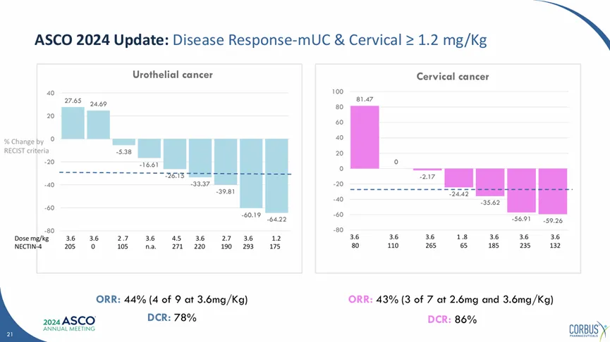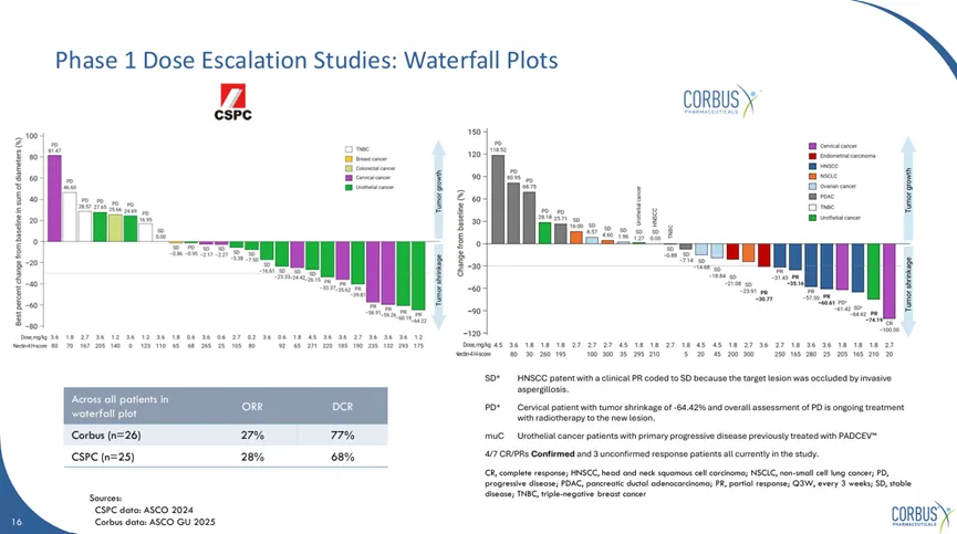 2024年2月14日,2025 ASCO GU会议上,石药合作伙伴Courbus首次公布了SYS6002在美国进行的I期临床数据,整体人群中取得了27%的客观响应率,77%的疾病控制率,于中国人群高度一致。在特定适应症中有部分差异,美国临床尿路上皮癌中取得了25%的客观响应率,50%的疾病控制率;在宫颈癌中取得了50%的客观响应率,50%的疾病控制率。