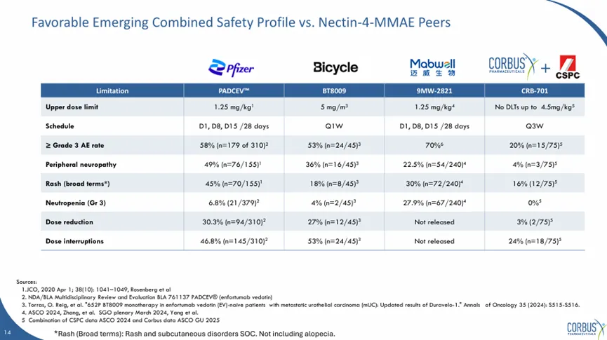 安全性方面,相较于目前其它Nectin-4的偶联药物,SYS6002表现出极佳的安全性,特别毒素相关的不良反应要先祖低于其它产品,即便在4.5mg/kg也没有出现剂量限制性毒性,目前石药优先选择了2.7mg/kg和3.6mg/kg作为拓展组。