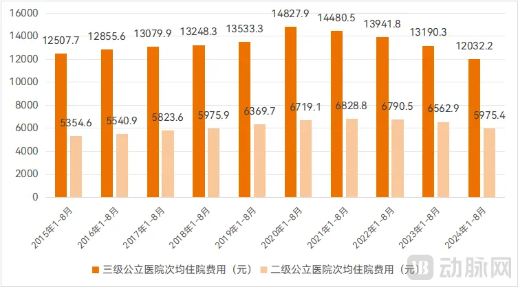 据国家卫健委发布的数据显示,2024年1-8月,全国三级公立医院次均住院费用为12032.2元,是十年来的最低水平,甚至比更早的2014年同期还略低;这一数据与2023年同期比较下降9.0%(按可比价格),也是十年来的最大降幅。