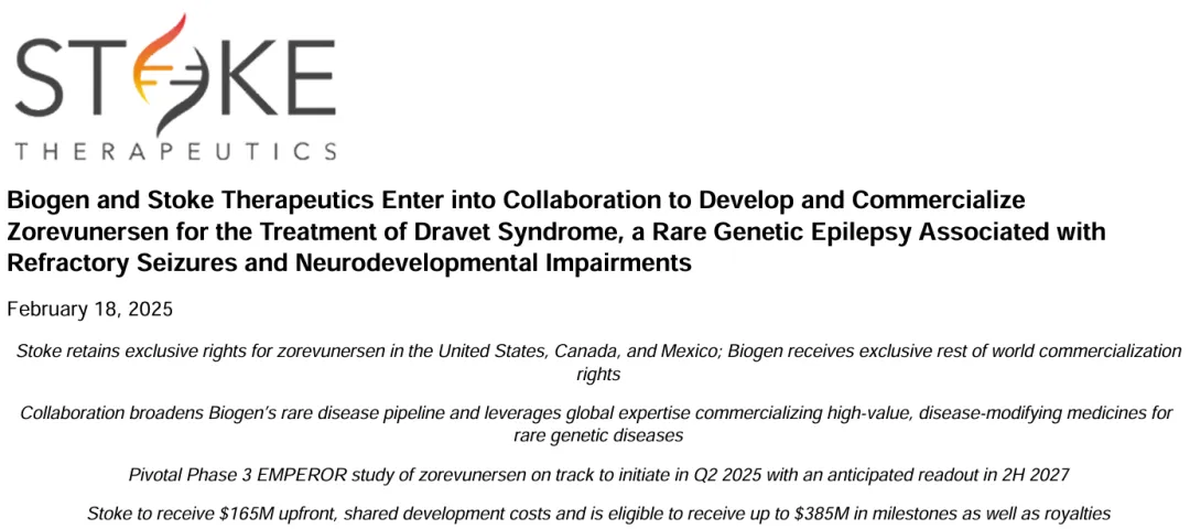 2月18日,Biogen和Stoke Therapeutics宣布达成合作协议,Biogen将获得在美国、加拿大和墨西哥以外的所有地区合作开发和商业化Zorevunersen,这是一种潜在的一线疾病改良药物,正在开发用于治疗Dravet综合征。Zorevunersen是一种针对SCN1A基因的反义寡核苷酸(ASO),SCN1A基因是大多数Dravet综合征病例的根本原因。Stoke最近宣布在与美国、欧洲和日本的监管机构成功合作后,计划启动zorevunersen(EMPEROR)的全球3期注册研究。该研究将于2025年第二季度启动,预计2027年下半年将公布关键数据,预计将支持全球监管上市申请。