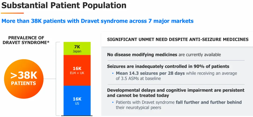 Dravet综合征患者仍有大量未满足的治疗需求,这是一种严重的遗传性发育性癫痫脑病,其特征是严重的复发性癫痫发作以及严重的认知和行为障碍。Dravet综合征难以治疗,长期预后不佳,目前还没有批准的疾病改良疗法。目前,据估计,在美国、英国、欧盟四国和日本,多达3.8万人患有Dravet综合征。