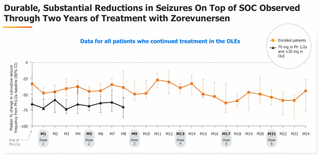 根据初步临床证据,Zorevunersen已被美国FDA授予突破性治疗认定,表明该药物在临床重要终点上可能比现有治疗有实质性改善。来自zorevunersen的1/2a期和开放标签扩展(OLE)研究的数据表明,接受zorevunesen治疗的患者抽搐发作频率显著降低,认知和行为的多种指标得到改善,这支持了向具有疾病改变潜力的全球注册3期研究的进展。在所有研究中,Zorevunersen的耐受性普遍良好。