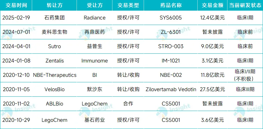 SYS6005 采用石药集团专有的酶催化定点偶联技术开发而成,毒素为 MMAE,具有均匀的 DAR 分布、高稳定性的连接子,以及较低的药物抗体比率,疗效和安全性都有保障。同时,SYS6005 还是进展最快的国产 ROR1 ADC ,在全球范围内进度也排在前列,仅次于 Zilovertamab Vedotin(III 期,默沙东)、CS5001(I期,LegoChem/基石药业)。凭借技术和进度优势,SYS6005 成为新一个十亿美元出海的 ADC 产品也并不令人意外。根据 Insight 数据库,加上 SYS6005,全球围绕 ROR1 ADC 达成的 BD 交易已经有 8 起。