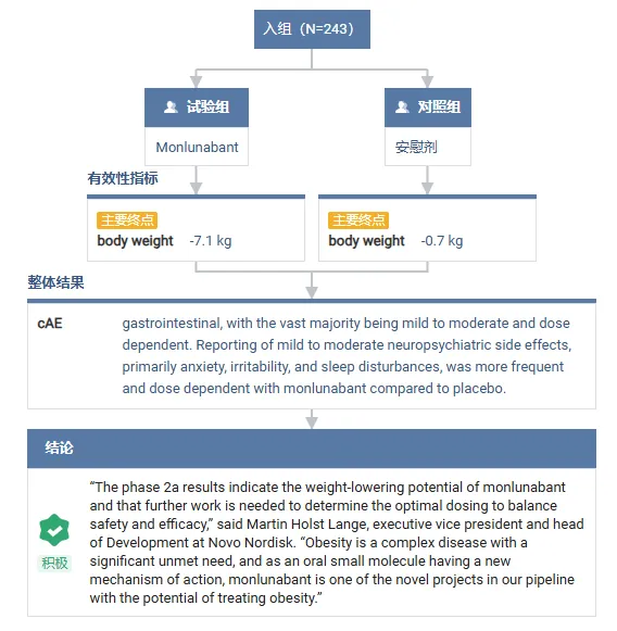 2024 年 9 月,诺和诺德公布该药一项 IIa 期研究(NCT05891834)的积极结果。数据显示,经过 16 周治疗,每日服用 10 mg 的 Monlunabant 组减重 7.1 kg,显著多于安慰剂组(vs 0.7 kg),高剂量组获得的额外减重效果有限。在安全性方面,最常见的不良事件是胃肠道反应。相较于安慰剂组,Monlunabant 组报告了剂量依赖性的轻中度精神副作用。