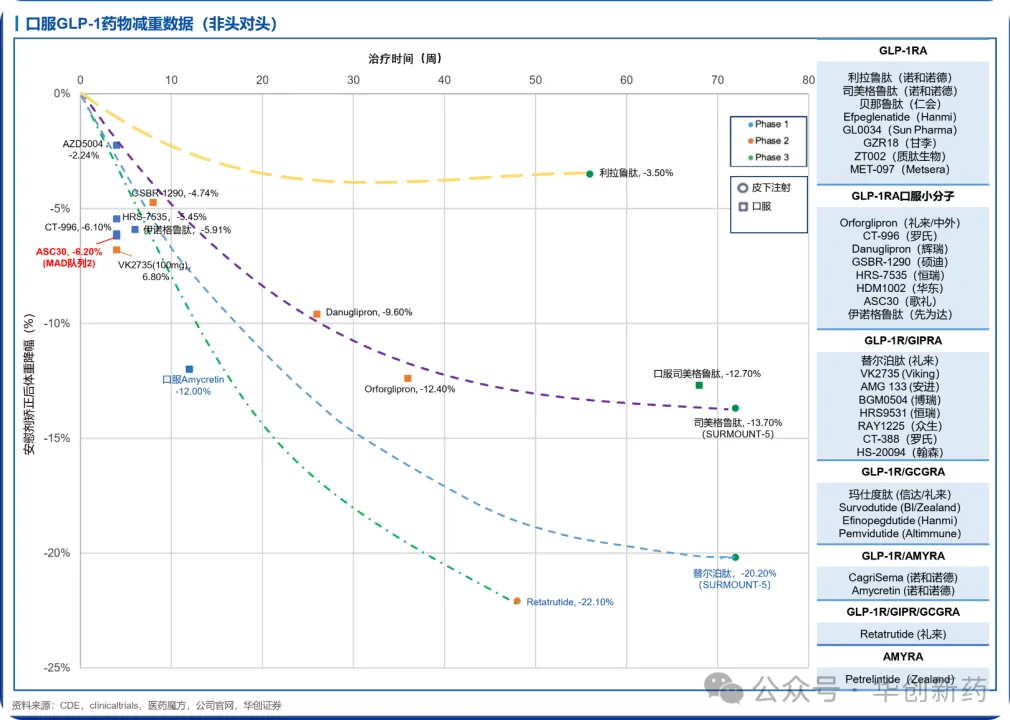 而在口服剂型方面,目前来看ASC30也没有让我们失望,它的临床数据非常好。这个数据到底有多么好,可以看下图,该图是华创证券医药组整理的口服版本GLP-1类型药物的减重时间—减重百分比的坐标图。横轴代表治疗时间(以周为单位),纵轴代表减重百分比。因此,能够在越短的时间内减重幅度下降最多,方为疗效最佳。