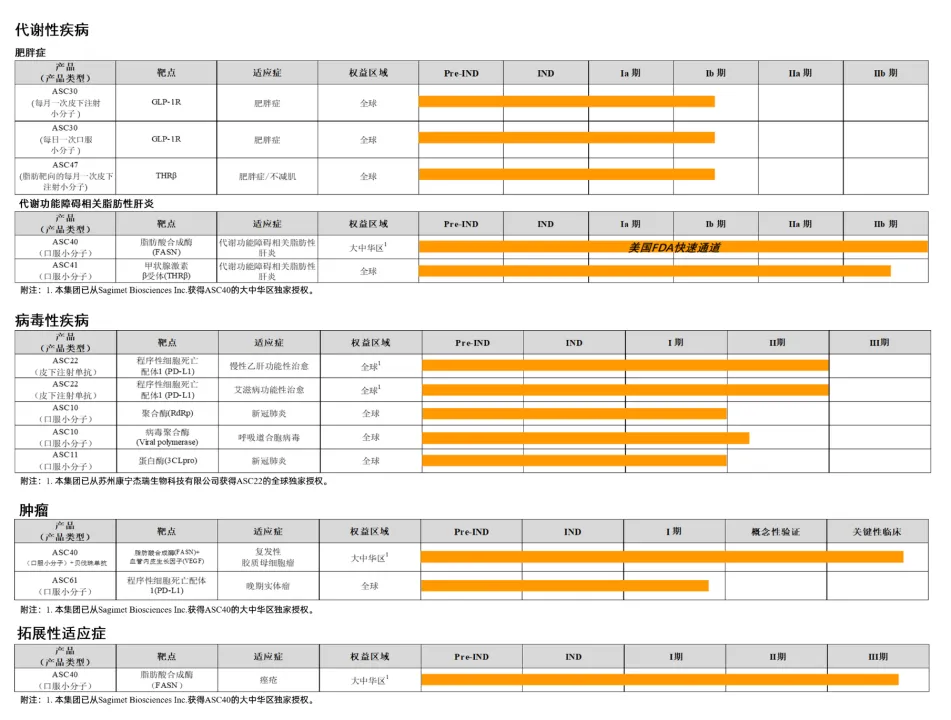 ASC40可以说是歌礼制药整个药企而言的核心管线,一款选择性的脂肪酸合成酶(FASN)口服小分子抑制剂,该管线是歌礼制药从Sagimet Biosciences处license in,歌礼制药拥有其大中华区权益。由于该酶在脂肪合成中发挥着重要的作用,因此ASC40的适应症非常广泛,从座疮到肿瘤到MASH,ASC40都有布局。