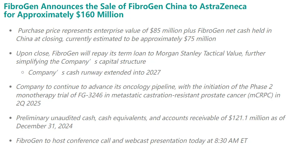 2月20日,旧金山,FibroGen(NASDAQ:FGEN)宣布以约1.6亿美元的价格将其中国子公司出售给阿斯利康。