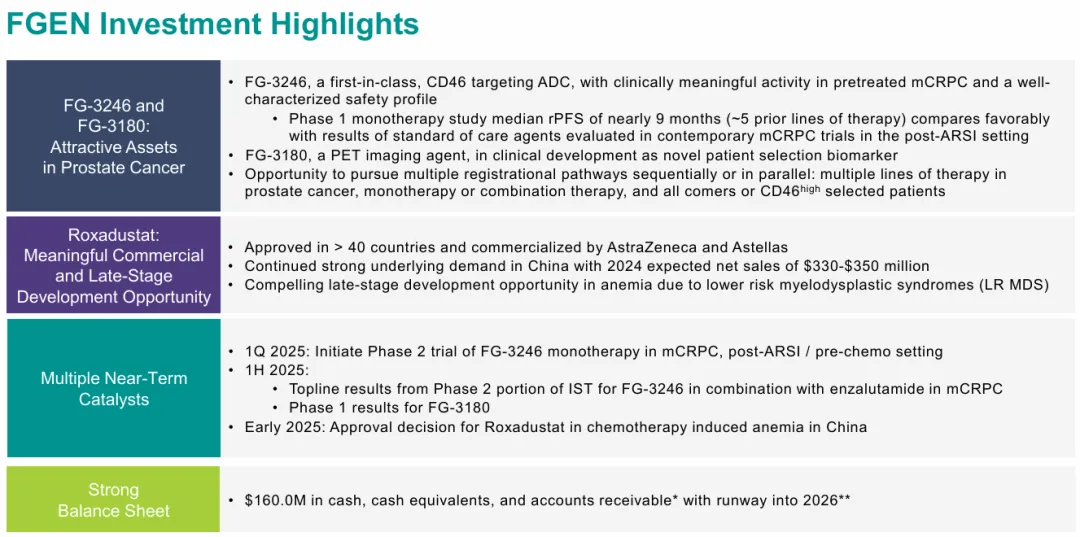 此外,FibroGen继续推进其主要资产FG-3246及其配套PET成像剂FG-3180的临床开发,预计将于2025年第二季度在mCRPC患者中启动FG-3246的2期单药治疗试验。