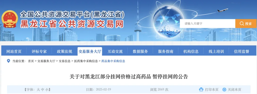 2月19日,黑龙江公共资源交易中心发布《关于对黑龙江部分挂网价格过高药品暂停挂网的公告》称,对黑龙江存在挂网价格高于全国最低价、包装和规格价格倒挂等情况未及时申报动态调整或未调整到位的药品及仿制药挂网价格高于参比制剂价格的药品进行暂停挂网处理。