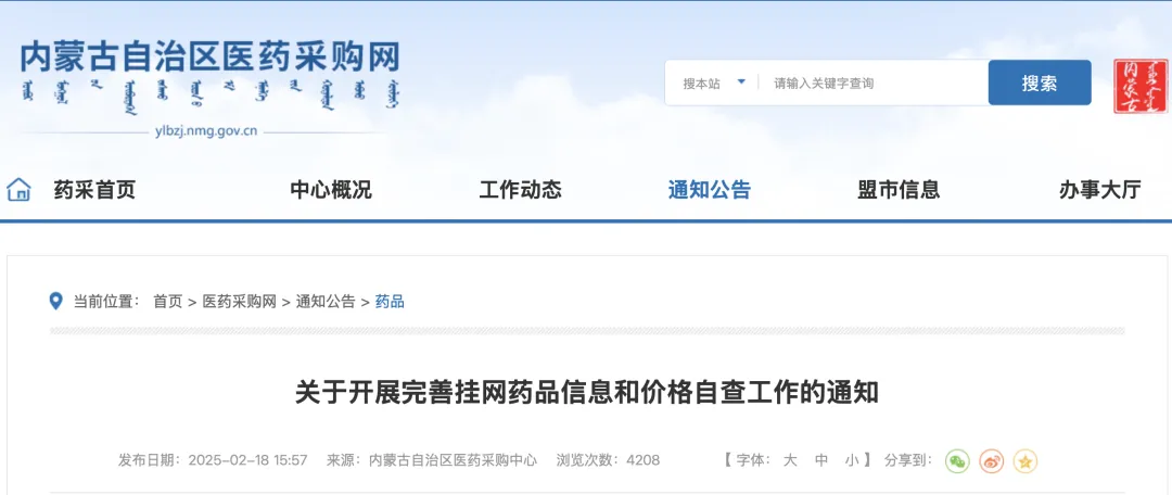 这份公告的前一日(2月18日),内蒙古自治区医药采购网发布《内蒙古自治区关于开展完善挂网药品信息和价格自查工作的通知》,同样提到了“药品挂网价格一览表”。