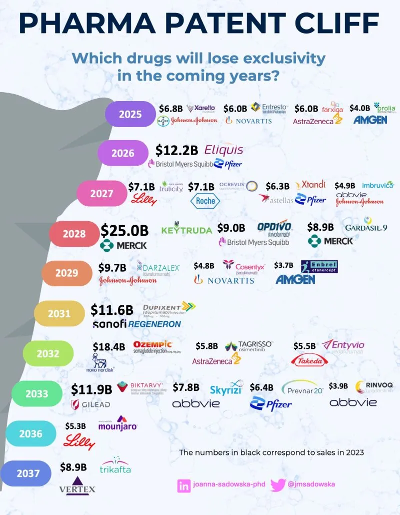 今年年初,Joanna Sadowska博士在领英(linkedin)上发布了一张“Pharma 专利悬崖”图谱。她指出,未来几年将有近200种药物失去专利保护,其中包括至少69种年销售额超10亿美元的重磅炸弹药物,累计损失销售额超3000亿美元。