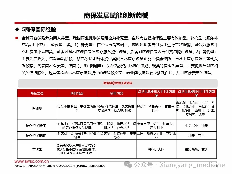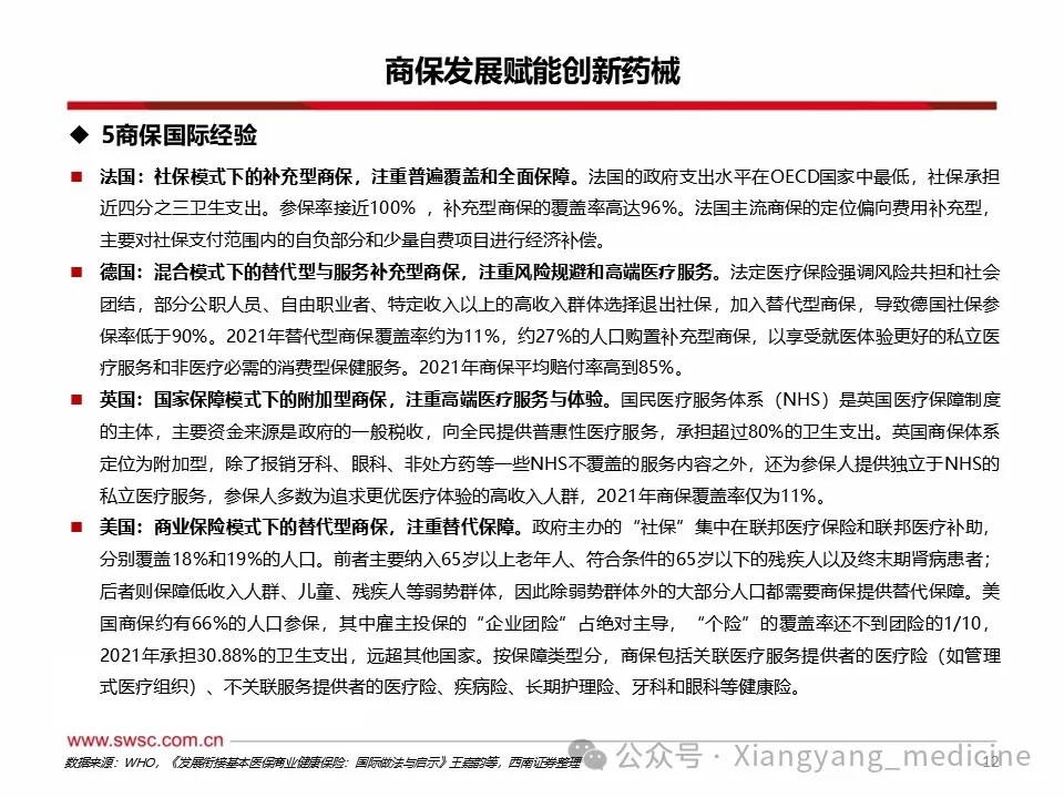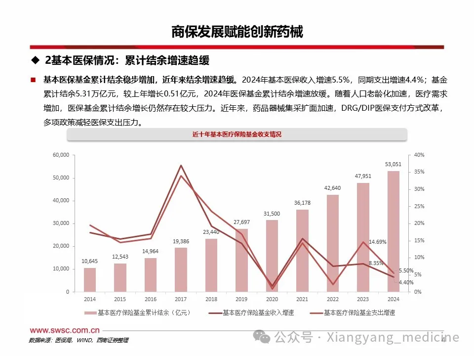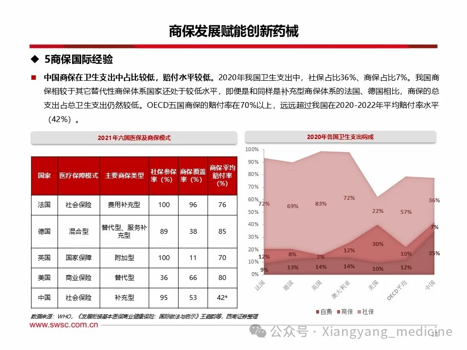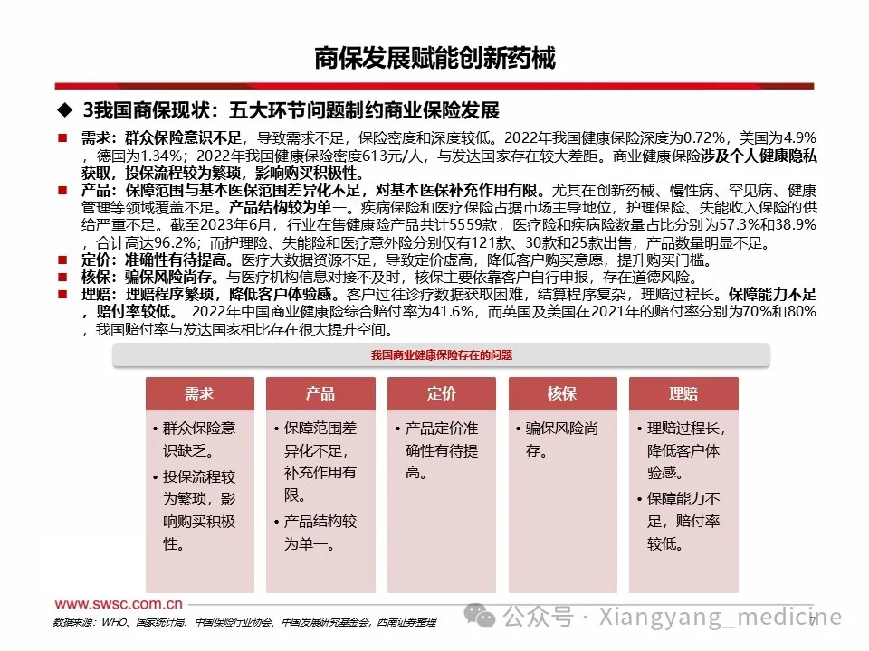 医保控费大势所趋,商保补充作用有限。我国目前形成以医疗救助为托底,以基本医疗保险为主体,以商业医疗保险为补充的医疗保险体系。1)从医保基金累计结余增长来看仍然存在较大压力,2023年我国基本医保参保人数达到13.3亿人,2024年基本医保收入增速5.5%,同期支出增速4.4%,支出增速再次大于收入增速,基金累计结余5.31万亿元,较上年增长0.51亿元,2024年医保基金累计结余增速放缓。2)商业医疗保险作为基本医保的补充保障,2022年商业健康保险支出3600亿元,同期基本医疗保险支出24697.2亿元,为商保支出的6.9倍。商业健康保险的支出占比仅仅占到总体保险体系支出的13%,作用仍然有限。3)参考国际经验,中国商保在卫生支出中占比较低,赔付水平较低。2021年我国卫生支出中,社保占比36%、商保占比7%。我国商保占比相较于其它替代性商保体系美国(30%)还处于较低水平,和同样是补充型商保体系的法国(12%)相比仍有差距。OECD五国商保的赔付率在70%以上,远远超过我国在2020-2022年平均赔付率水平(42%)。