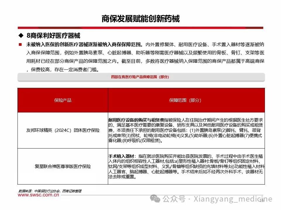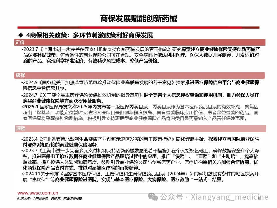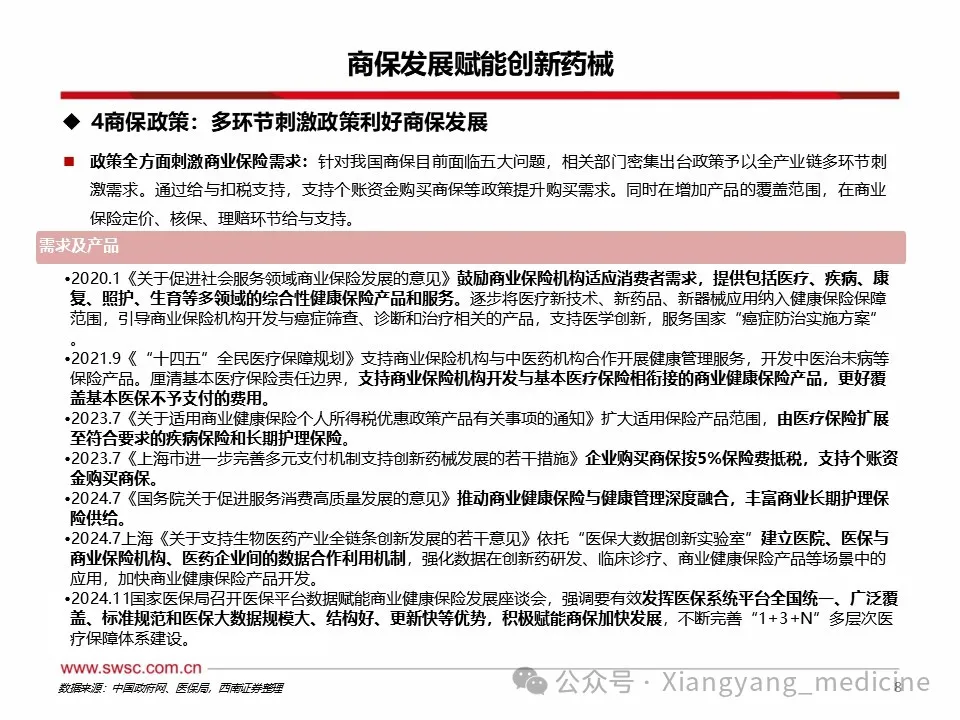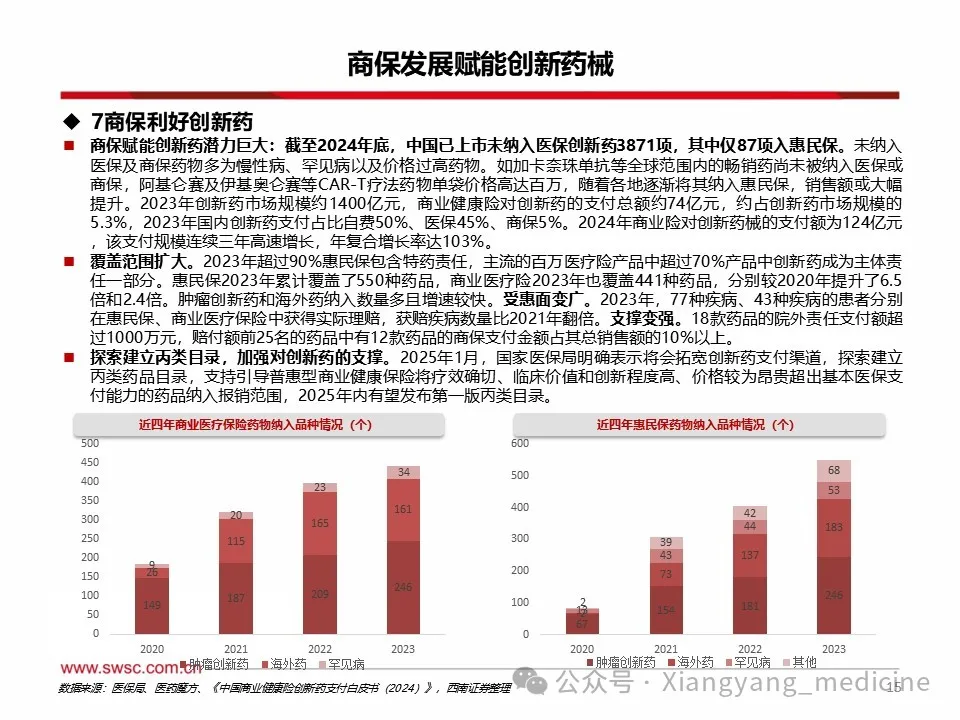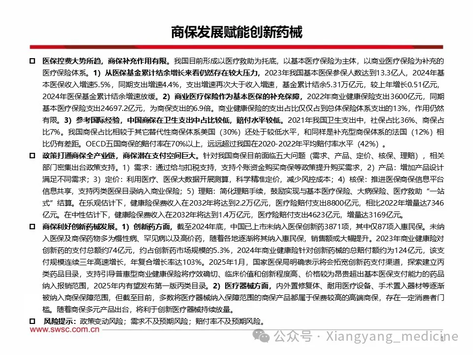 商保利好创新药械发展。1)创新药方面,至2024年底,中国已上市未纳入医保创新药3871项,其中仅87项入惠民保。未纳入医保及商保药物多为慢性病、罕见病以及高价药,随着各地逐渐将其纳入惠民保,销售额或大幅提升。2023年商业健康险对创新药的支付总额约74亿元,约占创新药市场规模的5.3%,2024年商业健康险针对创新药械的总赔付额约为124亿元,该支付规模连续三年高速增长,年复合增长率达103%。2025年1月,国家医保局明确表示将会拓宽创新药支付渠道,探索建立丙类药品目录,支持引导普惠型商业健康保险将疗效确切、临床价值和创新程度高、价格较为昂贵超出基本医保支付能力的药品纳入报销范围,2025年内有望发布第一版丙类目录。2)医疗器械方面,内外置修复体、耐用医疗设备、手术置入器材等逐渐被纳入商保保障范围,但截至目前,多数将医疗器械纳入保障范围的商保产品都属于保费较高的高端商保,存在一定消费者门槛。随着商保多元产品出台,将利于创新医疗器械持续放量。风险提示:政策变动风险;需求不及预期风险;赔付率不及预期风险。