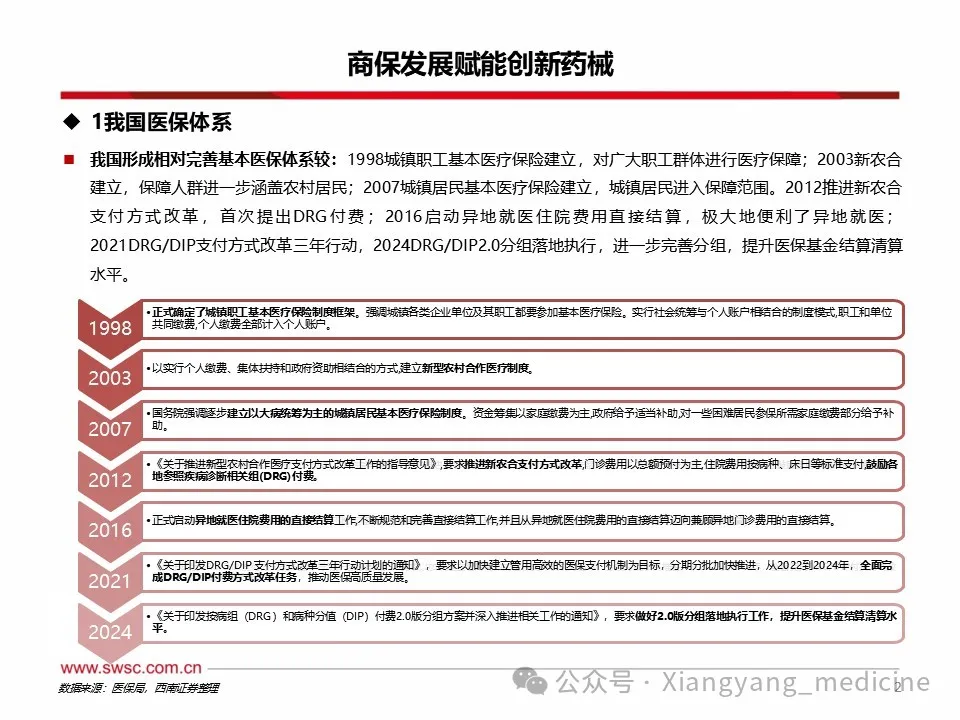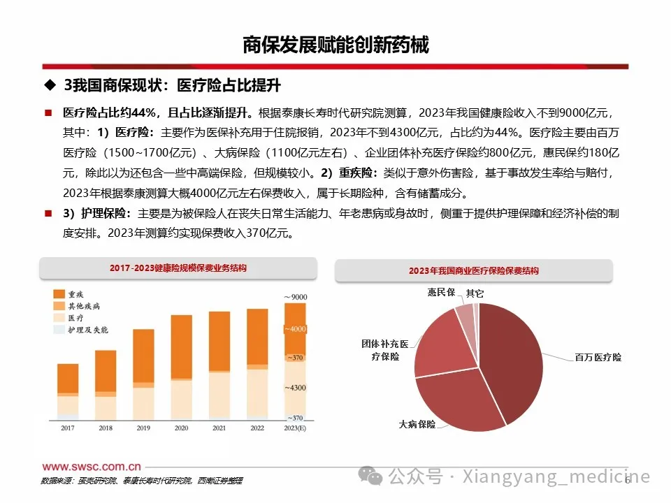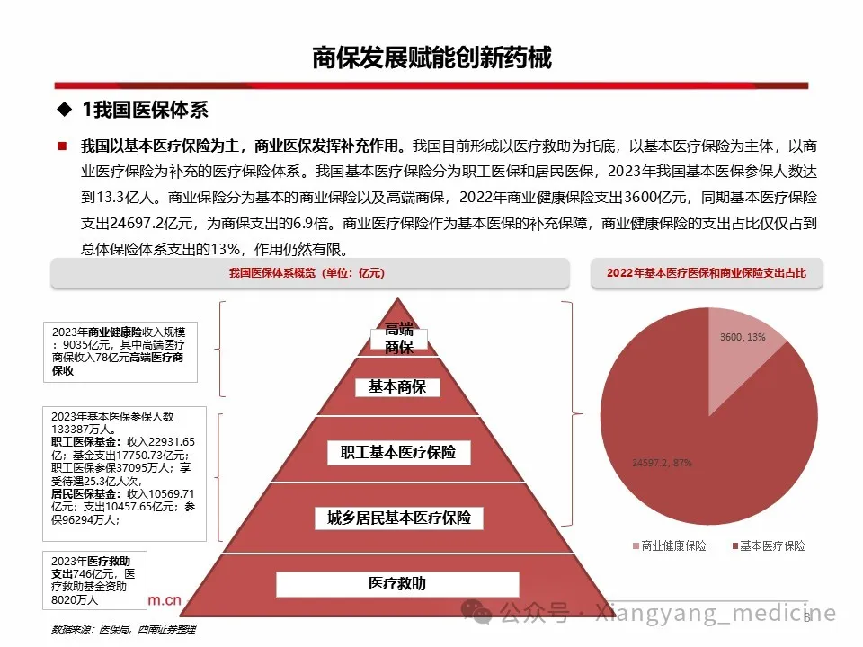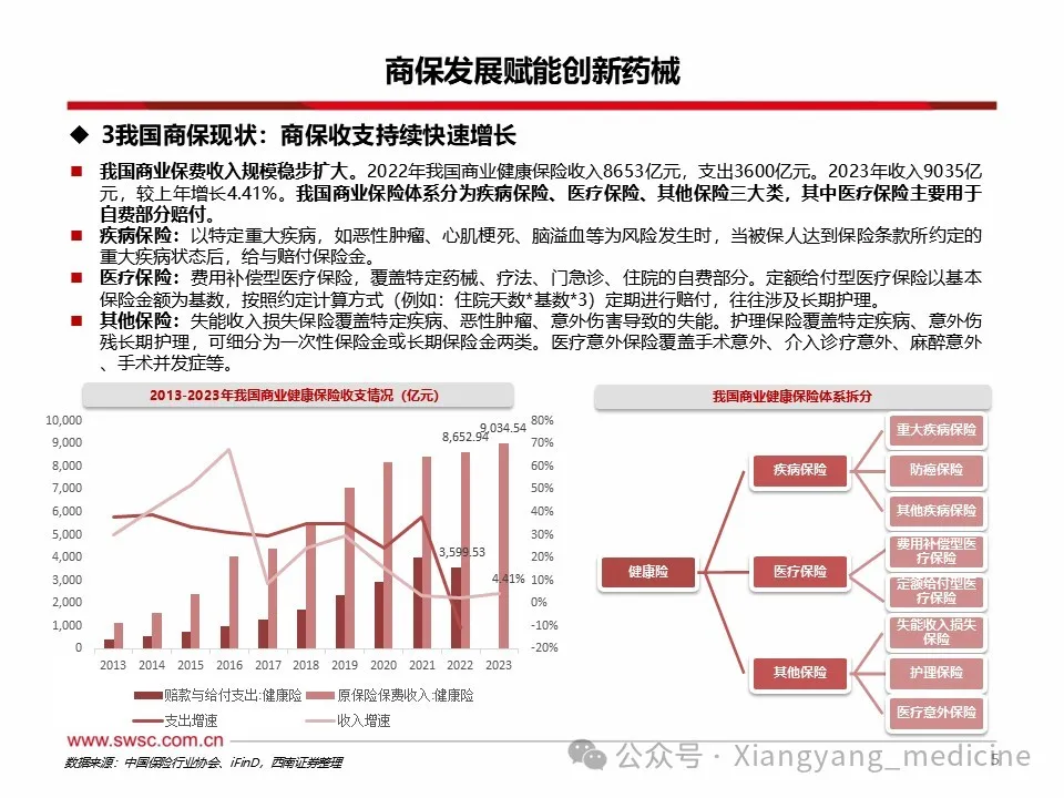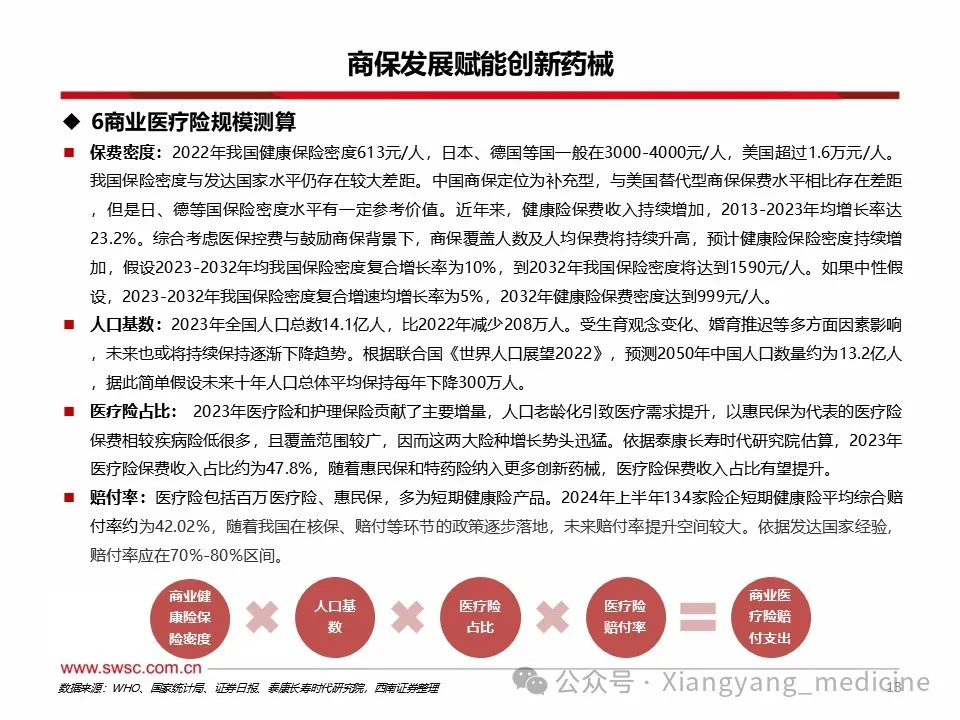 商保利好创新药械发展。1)创新药方面,至2024年底,中国已上市未纳入医保创新药3871项,其中仅87项入惠民保。未纳入医保及商保药物多为慢性病、罕见病以及高价药,随着各地逐渐将其纳入惠民保,销售额或大幅提升。2023年商业健康险对创新药的支付总额约74亿元,约占创新药市场规模的5.3%,2024年商业健康险针对创新药械的总赔付额约为124亿元,该支付规模连续三年高速增长,年复合增长率达103%。2025年1月,国家医保局明确表示将会拓宽创新药支付渠道,探索建立丙类药品目录,支持引导普惠型商业健康保险将疗效确切、临床价值和创新程度高、价格较为昂贵超出基本医保支付能力的药品纳入报销范围,2025年内有望发布第一版丙类目录。2)医疗器械方面,内外置修复体、耐用医疗设备、手术置入器材等逐渐被纳入商保保障范围,但截至目前,多数将医疗器械纳入保障范围的商保产品都属于保费较高的高端商保,存在一定消费者门槛。随着商保多元产品出台,将利于创新医疗器械持续放量。风险提示:政策变动风险;需求不及预期风险;赔付率不及预期风险。