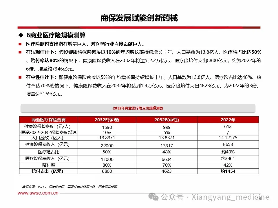 政策打通商保全产业链,商保潜在支付空间巨大。针对我国商保目前面临五大问题(需求、产品、定价、核保、理赔),相关部门密集出台政策支持。1)需求:通过给与扣税支持,支持个账资金购买商保等政策提升购买需求,2)产品:增加产品设计满足不同需求;3)定价:利用医疗、医保大数据开展测算,科学精准定价,减少风控成本;4)核保:推进医保商保信息平台信息共享,支持丙类医保目录纳入商业保险;5)理赔:简化理赔手续,鼓励实现与基本医疗保险、大病保险、医疗救助“一站式”结算。在乐观估计下,健康险保费收入在2032年将达到2.2万亿元,医疗险赔付支出8800亿元,相比2022年增量达7346亿元。在中性估计下,健康险保费收入在2032年将达到1.4万亿元,医疗险赔付支出4623亿元,增量达3169亿元。