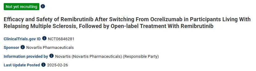 该研究是一项多中心、随机、开放标签、非劣效性临床试验(n=360),旨在评估复发性多发性硬化症(RMS)患者从奥瑞利珠单抗转换至Remibrutinib或坚持接受奥瑞利珠单抗治疗的疗效和安全性。研究的主要终点是第24个月时患者出现新发T2病灶或T2病灶扩大的年化发生率。