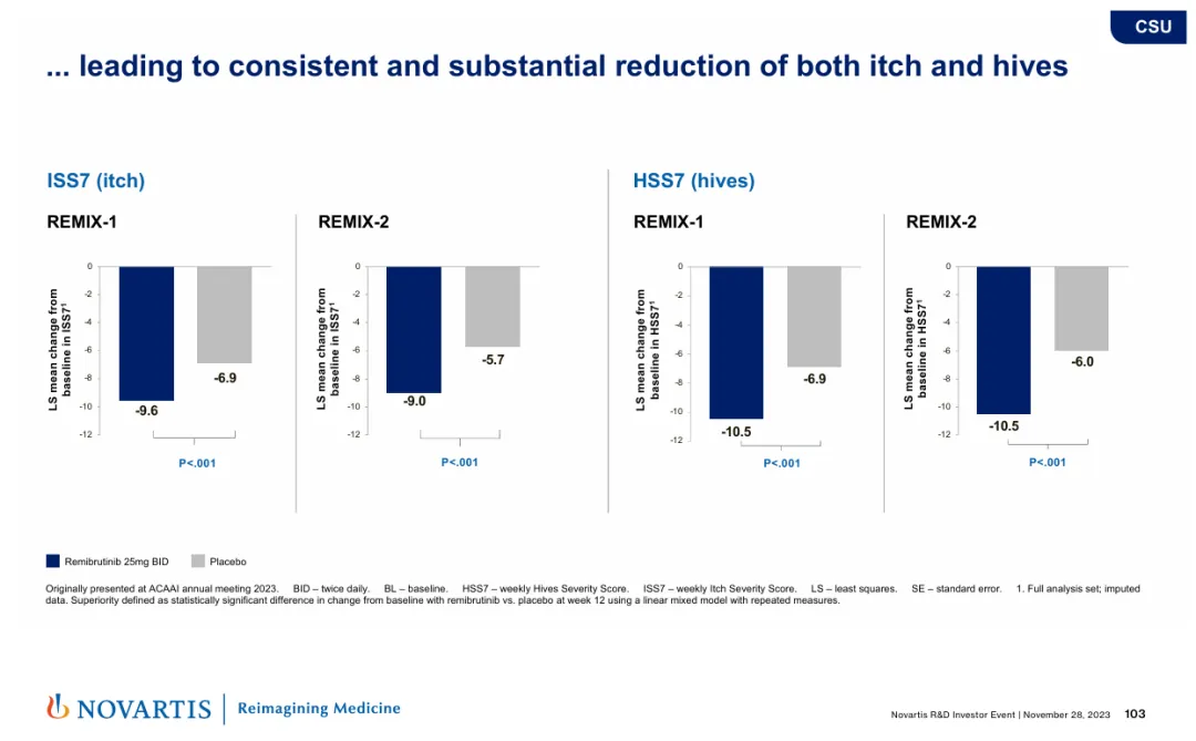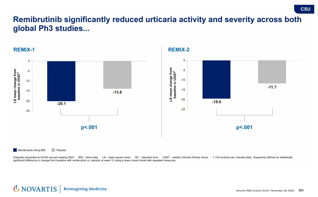 针对CSU的两项III期研究(REMIX-1和REMIX-2)已在2023年8月达到主要终点。结果显示,接受过H1抗组胺药物治疗但病情控制不佳的CSU患者接受Remibrutinib(25mg,每日2次)治疗12周后,每周荨麻疹活动度评分(UAS7)、瘙痒严重程度评分(ISS7)和荨麻疹严重程度评分(HSS7)均显著下降。