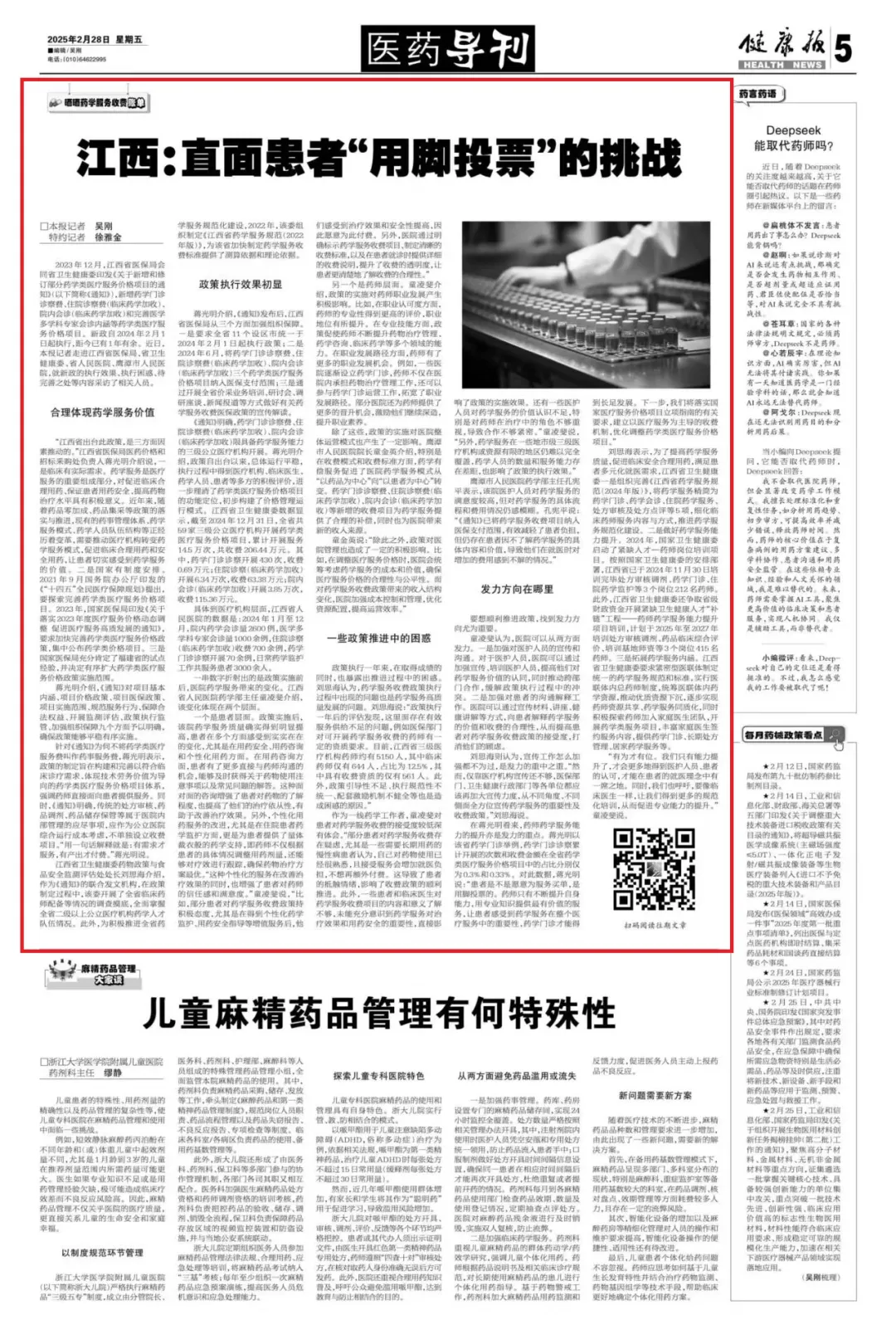 2023年12月,江西省医保局会同省卫生健康委印发《关于新增和修订部分药学类医疗服务价格项目的通知》(以下简称《通知》),新增药学门诊诊察费、住院诊察费(临床药学加收)、院内会诊(临床药学加收)和完善医学多学科专家会诊内涵等药学类医疗服务价格项目。新政自2024年2月1日起执行,距今已有1年有余。近日,本报记者走进江西省医保局、省卫生健康委、省人民医院、鹰潭市人民医院,就新政的执行效果、执行困惑、待完善之处等内容采访了相关人员。