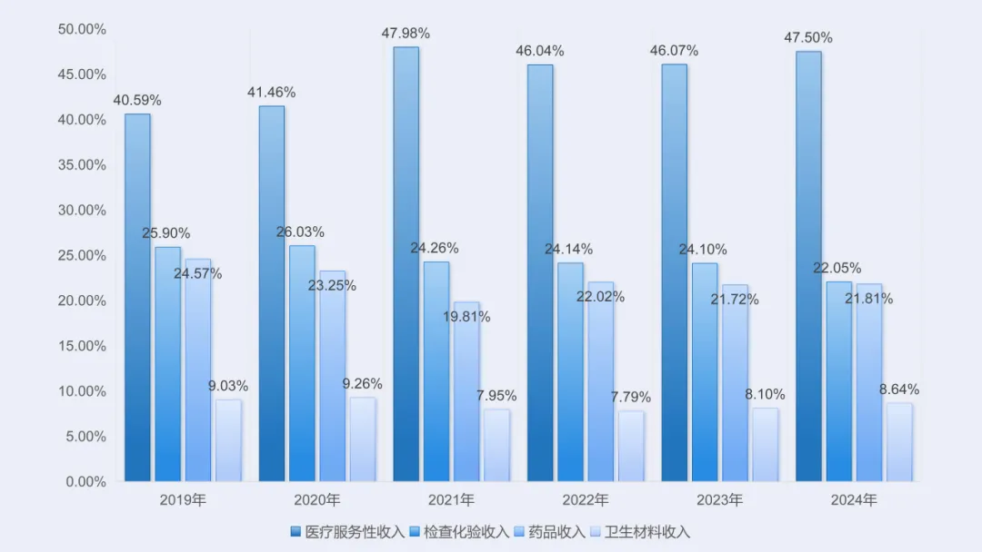 其中,医疗服务性收入182229.04万元,占医药收入47.50%(床位收入10700.67万元、手术治疗护理等服务收入161820.88万元、结算差额9707.49万元),与去年同期相比,医疗服务性收入减少823.61万元,下降0.45%;检查化验收入84613.43万元,占医药收入22.05%,同比下降11.63%;药品收入83664.33万元,药占比21.81%,分别比去年同期下降3.06%、增长0.08个百分点;卫生材料收入33144.01万元(其中高值耗材收入16381.63万元),占医药总收入8.64%,比去年同期8.10%,增长0.54个百分点。入院人次320229人次,比去年同期减少5096人次,下降1.57%;门急诊人次6793966人次,比去年同期增加154942人次,增长2.33%;门诊次均费用210.36元,比去年同期减少2.08元,下降0.98%;出院者平均费用7186.56元,比去年同期增加325.92元,增长4.75%。