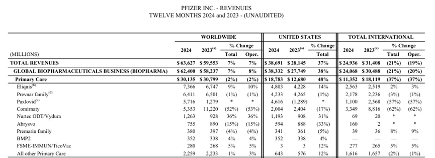 原本,辉瑞指望RSV疫苗Abrysvo在2023年5月获批,可以恰逢其时地抵消新冠疫苗收入下滑的影响。上市第一年,Abrysvo就展现出收入8.9亿美元的不俗表现,与直接竞争对手Arexvy(GSK)拼杀得难解难分。然而,到了2024年,Abrysvo和Arexvy却一同遭受当头一棒。美国CDC下属ACIP推荐接种人群年龄严格限定在70岁及以上,使得RSV疫苗市场规模大幅收缩,导致Abrysvo在2024年只收获了7.55亿美元,同比减少15%。好在成人市场份额提升,加上孕妇人群需求强劲,缓解了Abrysvo的下滑趋势。Abrysvo适用于孕妇人群的这一特征是其他两家竞争对手Arexvy和mRESVIA所没有的。总体来说,Abrysvo在美国市场的优势地位进一步提升,而美国以外市场收入强劲增长,特别是预计欧盟会在2025年批准其用于18-59岁人群,这也有望进一步促进其销售额提升。