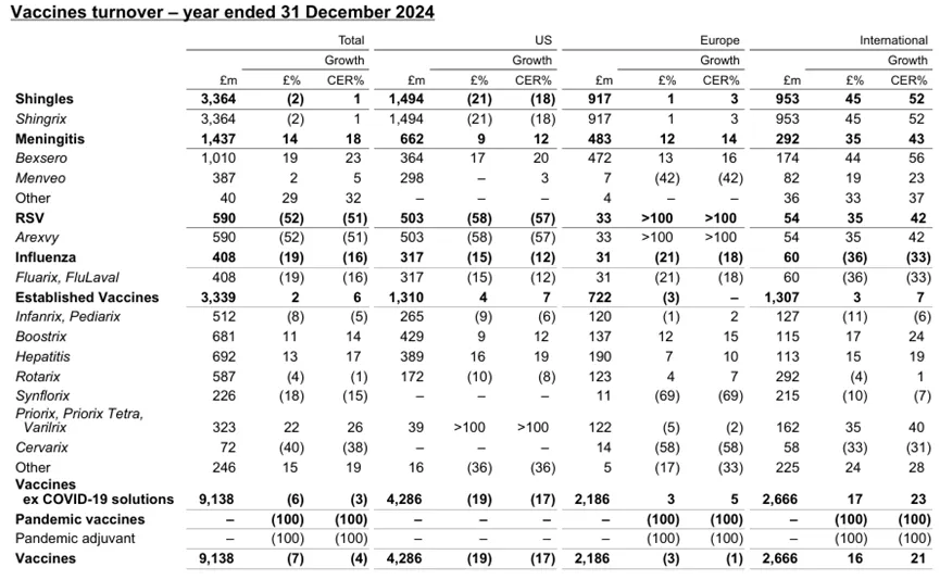 全年收入91.38亿英镑(约116.97亿美元,-7%)是GSK疫苗业务在2024年的成绩。辉瑞和默沙东的疫苗板块特别依赖于单品种,GSK也不例外。
