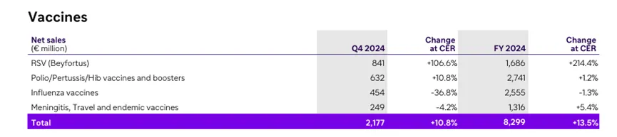 流感疫苗Fluarix/FluLaval,面临竞争压力且美国市场需求下滑,导致其2024年收入4.08亿英镑,同比减少19%。不过,在实施有利的渠道价格组合之后,Fluarix/FluLaval在第四季度重回增长。