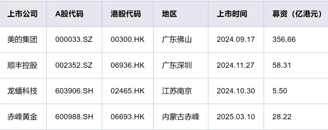 据瑞恩资本统计,2024年以来,一共有4家公司A股公司通过在港交所发行H股实现A+H上市,包括美的集团、顺丰控股、龙蟠科技、赤峰黄金。