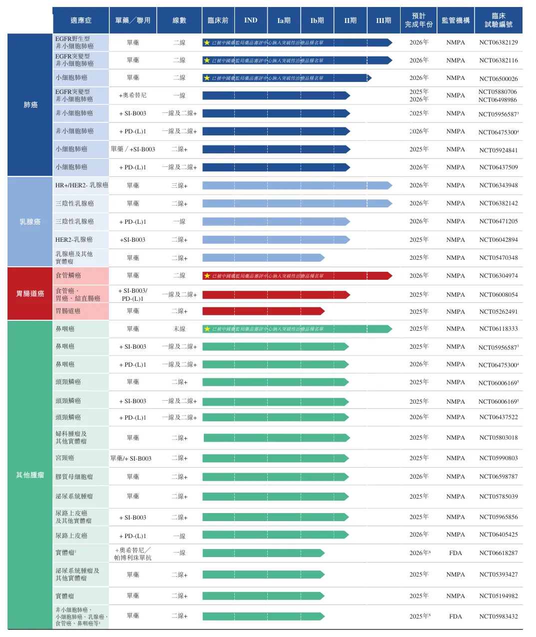 首先,BL-B01D1最早在国内进入临床三期的适应症是末线的鼻咽癌,公示日期在2023年10月底;从国内第一项三期临床开始,百利天恒为了探索BL-B01D1广谱疗效,截至目前已经启动了9项三期临床,覆盖适应症涵盖非小细胞肺癌(NSCLC)、小细胞肺癌(SCLC)、乳腺癌(BC)、食管鳞癌(ESCC)、鼻咽癌(NPC)等,另外还启动了多项二期临床探索在小细胞肺癌、宫颈癌、尿路上皮癌等多个癌种中的疗效。