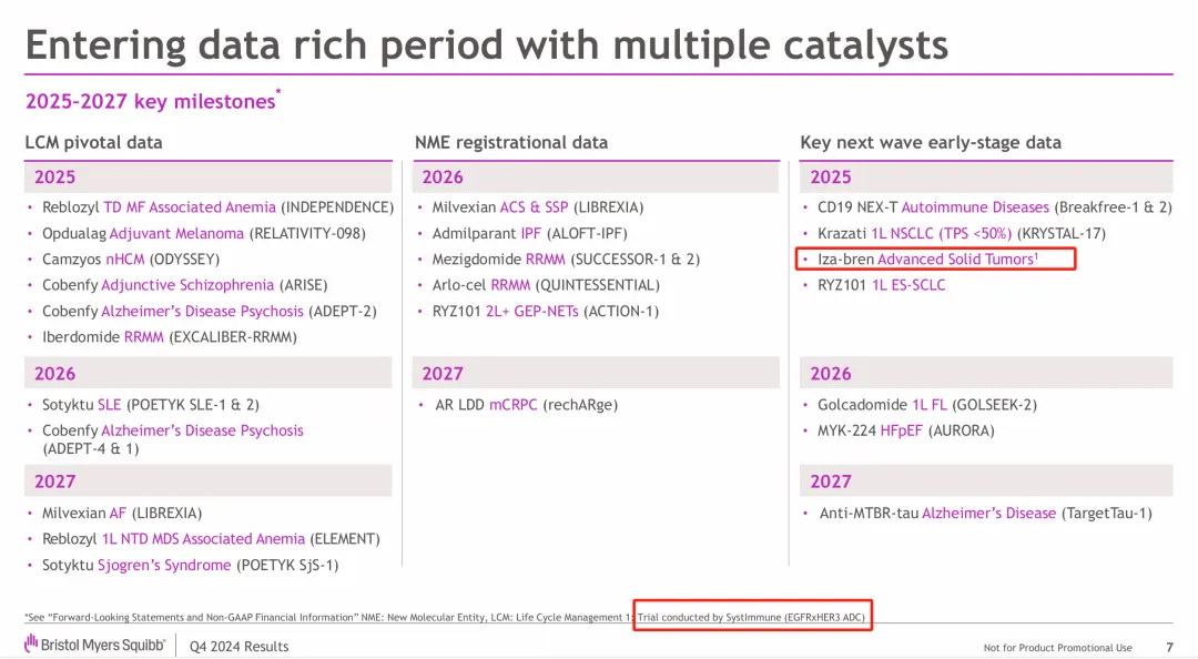 从百利天恒和BMS已披露的海外开发计划来看,公司在2023年8月在美国启动了NSCLC、SCLC、BC、ESCC、NPC等多项实体瘤的一期临床,还在2024年12月启动了联合奥希替尼/K药针对晚期实体瘤的I/IIa期临床,并且预计在2025年进行某种实体瘤的一线治疗注册临床和另一项实体瘤的二线治疗注册临床。