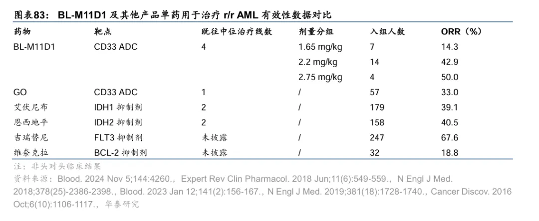 相较于GO,BL-M11D1拥有更宽的剂量窗口和潜在更好的安全性,其国内r/r AML一期临床数据显示,1.65mg/kg、2.2mg/kg、2.75mg/kg分别有7、14和4名患者可评估,分别录得ORR为14.3%、42.9%、50.0%。可以从非头对头的数据对比看出,在患者更后线的背景下,接受高剂量BL-M11D1治疗的患者ORR显著优于GO,同时其ORR表现不亚于各类靶向药物单药疗法。