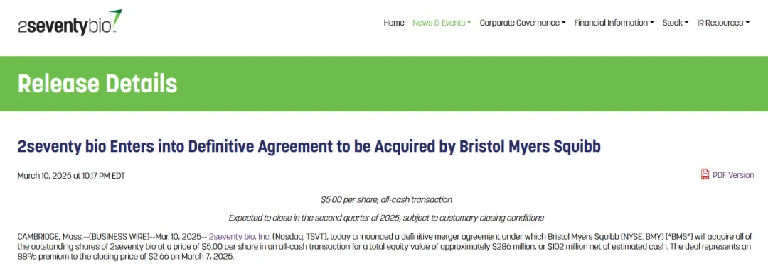 3月10日,CAR-T细胞疗法公司2seventy bio(由bluebird bio拆分而来)宣布被百时美施贵宝(BMS)以每股5.00美元的价格收购其所有流通股份,股本总价值约为2.86亿美元。与2025年3月7日的收盘价(每股2.66美元)相比,这笔交易溢价88%。交易预计将在2025年第二季度完成。