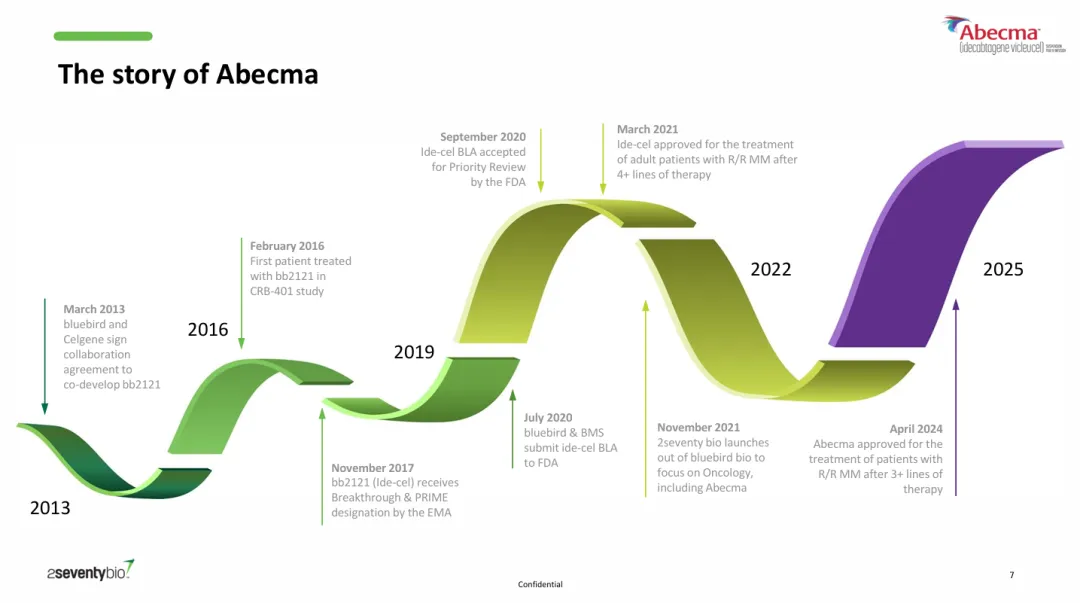 目前,2seventy bio管线中有多款CAR-T细胞疗法产品,其中Abecma(idecabtagene vicleucel)由BMS合作开发和商业化,已在2021年获批上市。截至今日,Abecma在全球获批为多发性骨髓瘤患者的三/四/五线治疗。据BMS财报,2024年Abecma销售额为4.06亿美元。