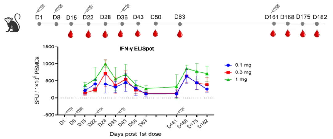在恒河猴体内,EVM16展现了3个显著的特点:起效快、强力,并且持久。如果在第161天打加强针,疫苗还能激发恒河猴体内产生强力且持久的T细胞应答。该实验结果与 Moderna、BioNTech的肿瘤疫苗所呈现的效果高度一致——二者的肿瘤疫苗在相关研究中均显示出能够显著延缓肿瘤复发的作用。这也侧面证明了, EVM16在后续人体临床的潜力不容忽视。